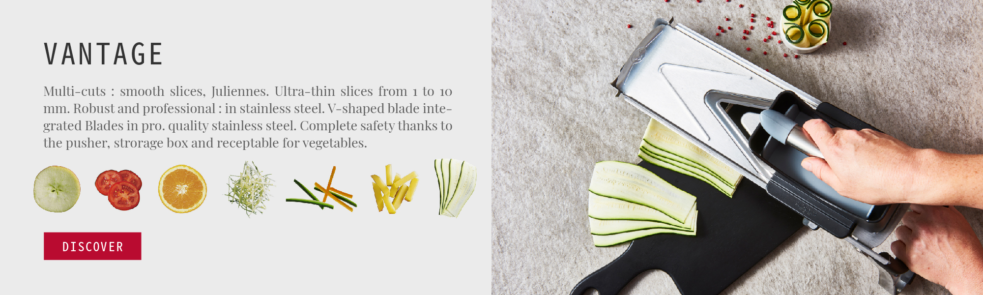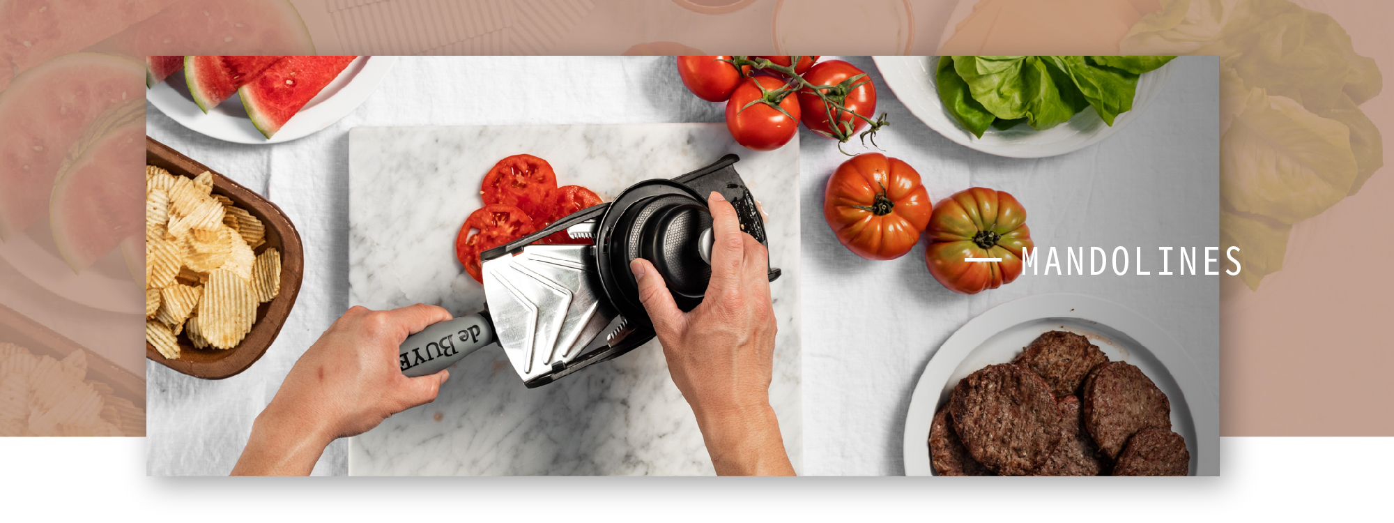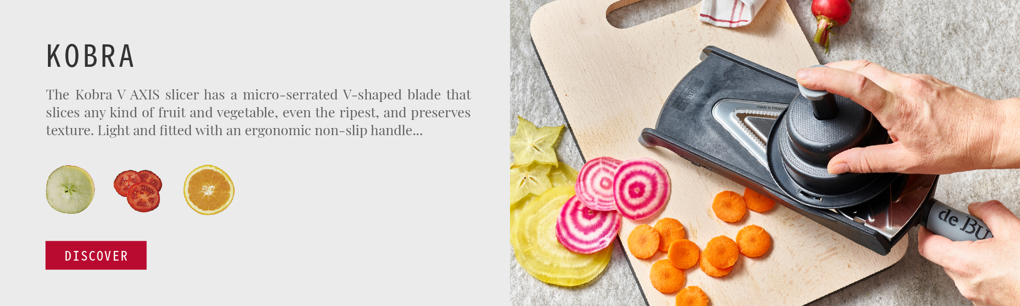 Shape your veggies and fruits cuts like a Chef, quickly and safely with de Buyer's slicers and mandolines. Slices, Julienne, cubes, rhombuses, waffle, crinkle will have no secret for you know. De Buyer mandolines are integrally made in their manufacture, in France (label "Origine France Garantie") which guarantees each piece can be repaired or replaced if needed.