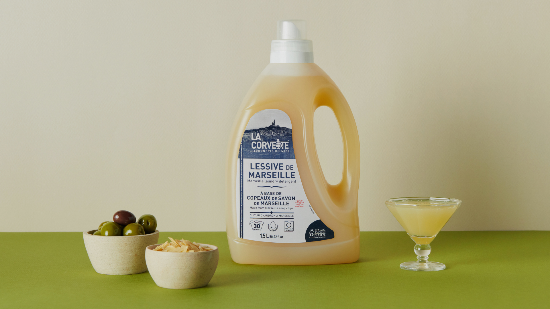 The effectiveness of Marseille soap in a ready-to-use formula! LA CORVETTE has developed a detergent formulated from its own Marseille soap shavings, cooked in a Marseille cauldron using 100% vegetable oils. This liquid Marseille soap detergent is certified by Ecocert. Hypoallergenic*, it is fragrance-free to respect even the most sensitive skin. Highly concentrated in Marseille soap, LA CORVETTE liquid Marseille soap detergent is suitable for all types of textiles, for hand-washing or machine-washing at 30°.