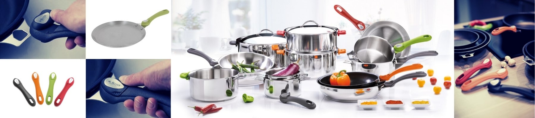MINERAL B REMOVABLE is a smart and convenient version of MINERAL B acclaimed pans. In this version, there’s no handle, just a clip to fix one of the 4 colors of de Buyer Soft Touch removable handle to be purchased separately (we propose a special add on package). Those handles follow de Buyer professional quality. It means their lock system is strong and solid. You can use just one handle not only with all MINERAL B REMOVABLE collection, but as well with some Stainless Steel and Nonstick de Buyer cookware collections TWISTY and CHOC EXTREME. It’s an important space saving option in your kitchen, even a possibility to use your pan in oven.