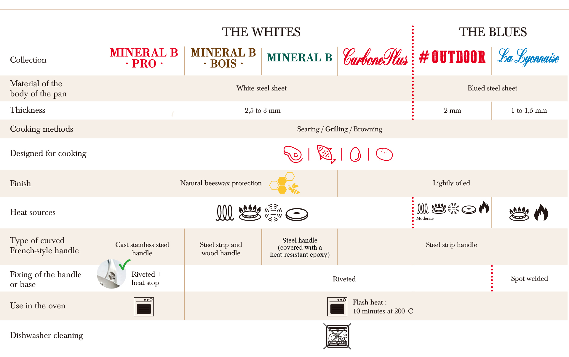 Mineral B, de Buyer white steel pan collections, receives a natural Bee wax finish (de Buyer patent) to protect them better from oxidation than the pre-heating process.