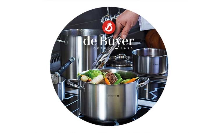 PRIM'APPETY cookware in AISI 304 stainless steel with pouring lips and sandwich bottom, which makes it compatible with induction and enables uniform heat distribution across the bottom of the cookware.