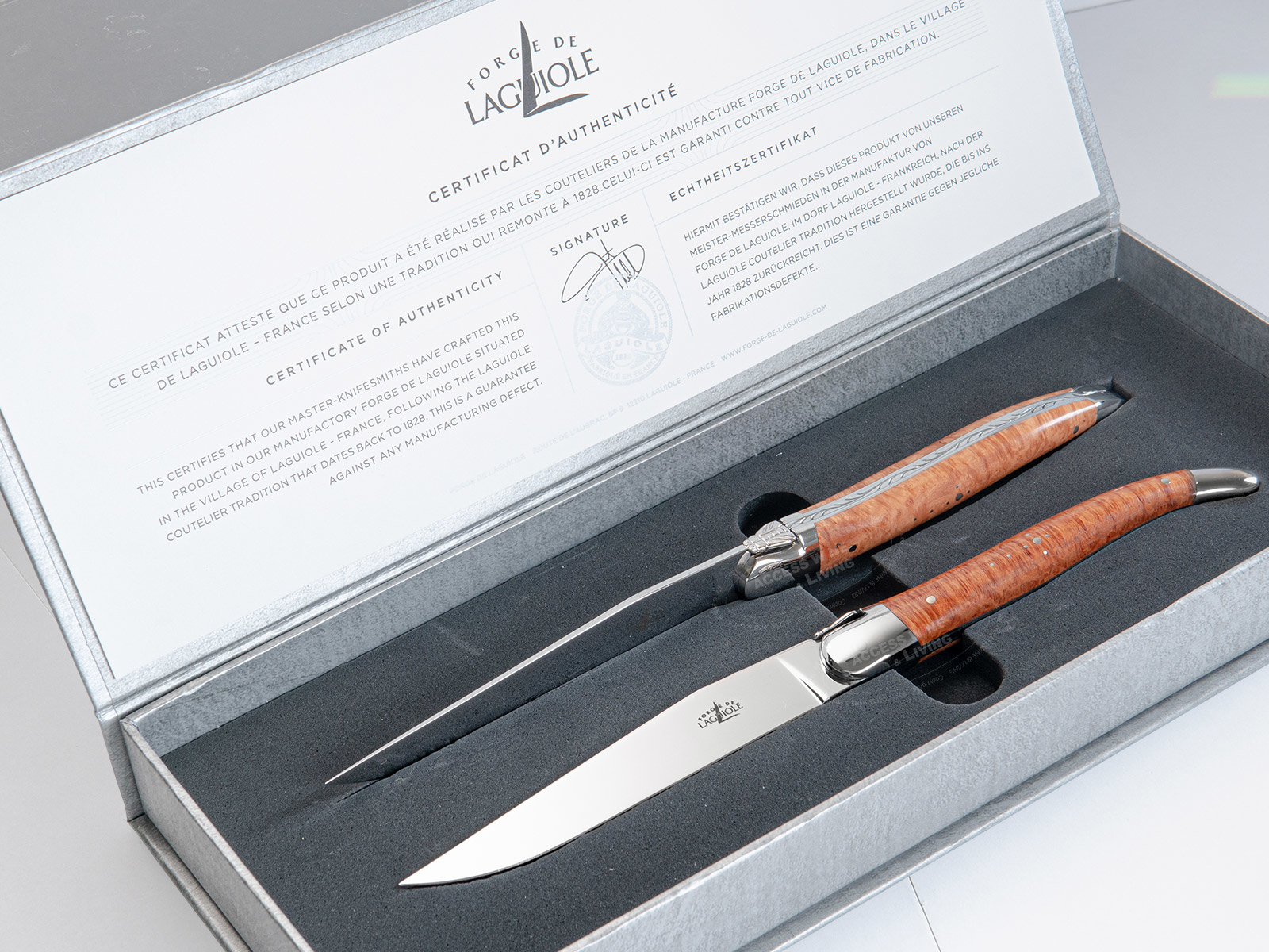 The blades are made from the high-quality French T12 steel, which is exclusively produced for Forge de Laguiole®. They are forged to 1000°C in their workshops forge in Laguiole, France.