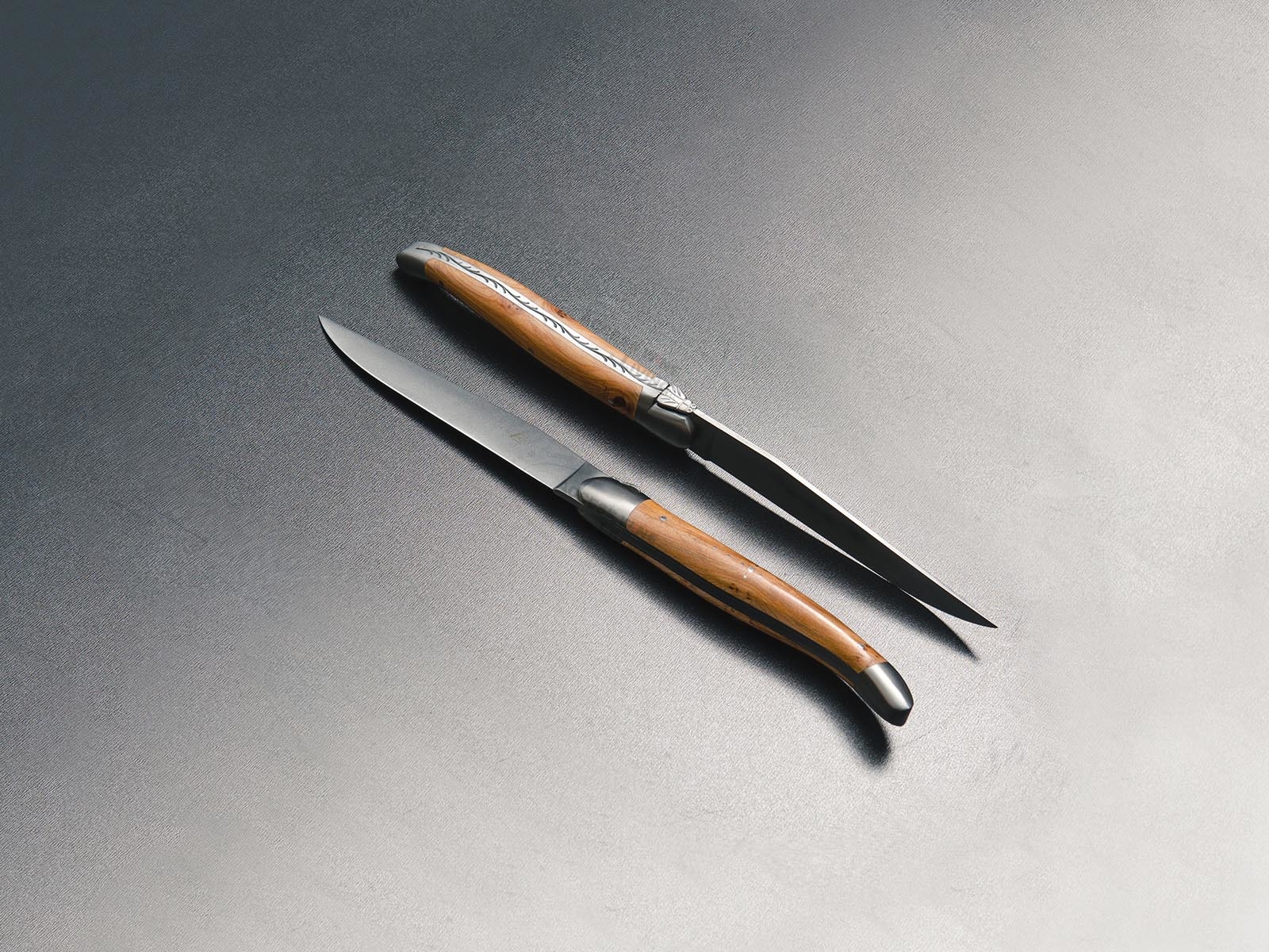 The blades are made from the high-quality French T12 steel, which is exclusively produced for Forge de Laguiole®. They are forged to 1000°C in their workshops forge in Laguiole, France.
