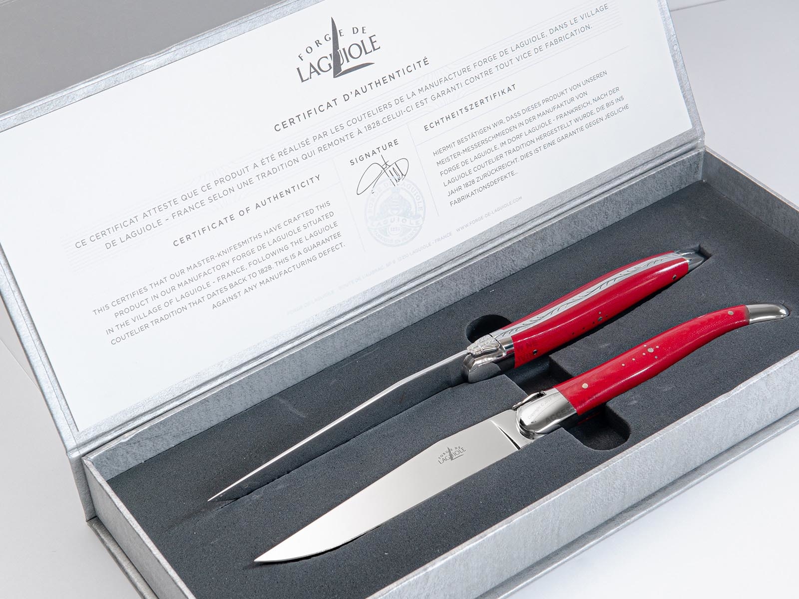 The blades are made from the high-quality French T12 steel, which is exclusively produced for Forge de Laguiole®. They are forged to 1000°C in their workshops forge in Laguiole, France.
