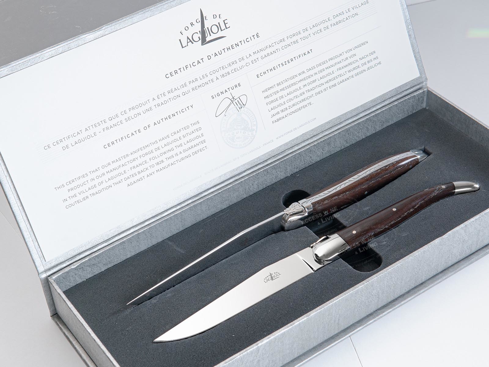 The blades are made from the high-quality French T12 steel, which is exclusively produced for Forge de Laguiole®. They are forged to 1000°C in their workshops forge in Laguiole, France.