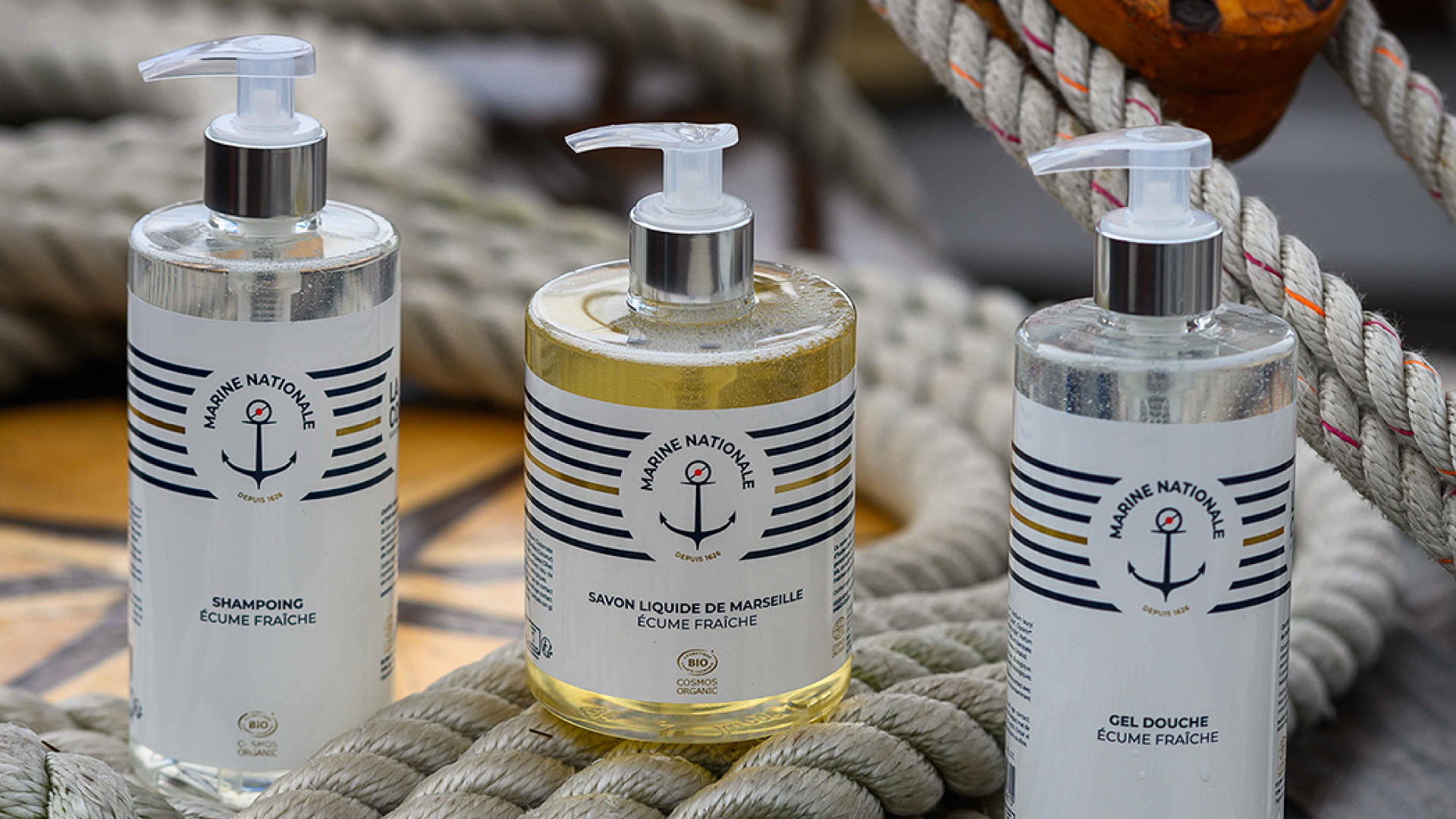 The range, called 'Écume Fraiche', includes a shampoo, a liquid soap and a shower gel. The fragrance, with the aromatic freshness of sea fennel, is a unique and exclusive creation developed for the French Navy in association with a perfumer in Grasse.