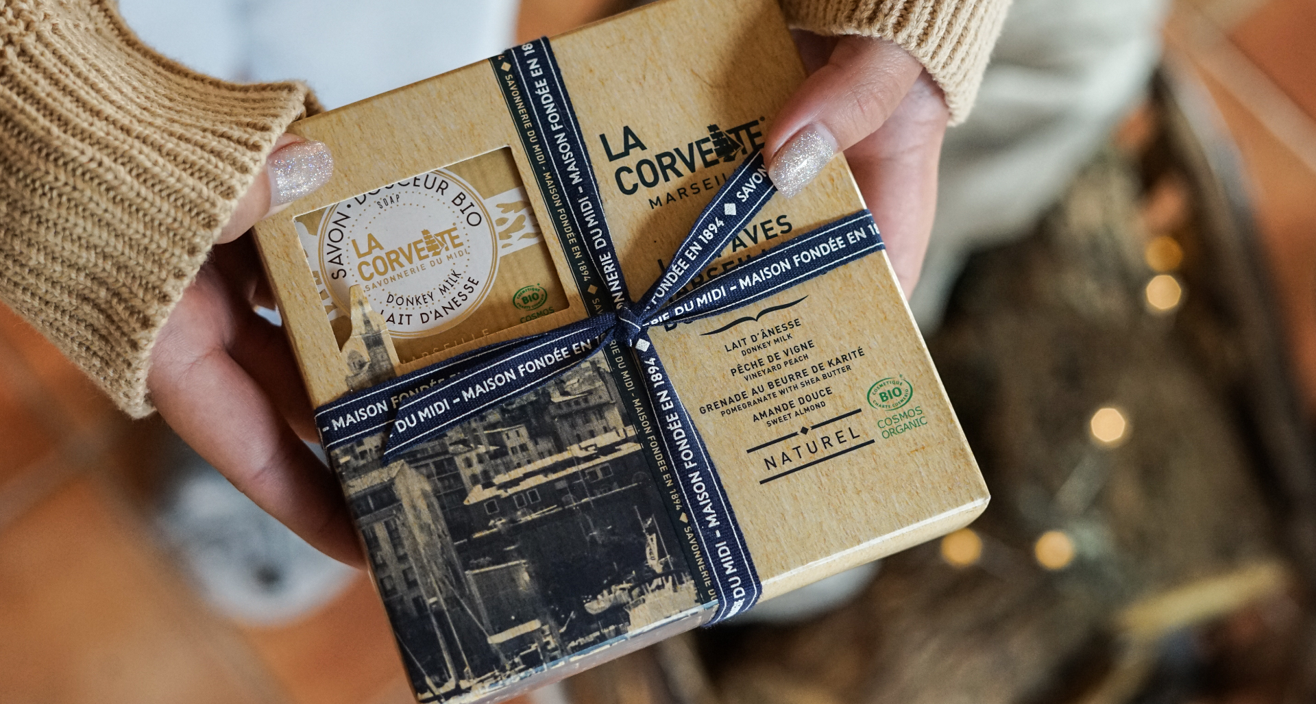 La Corvette 馬賽工藝的精髓,盡在我們的四塊裝 Cosmos Organic 有機香皂禮盒中。