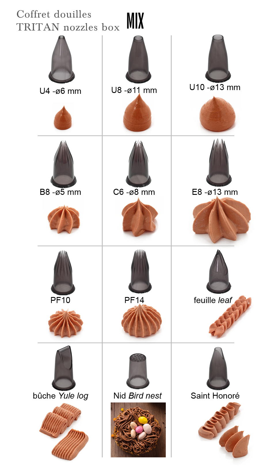 The nozzles can be used with any type of piping bag and with the  de Buyer TUBE.  Furthermore, each nozzle is marked with its specification model.