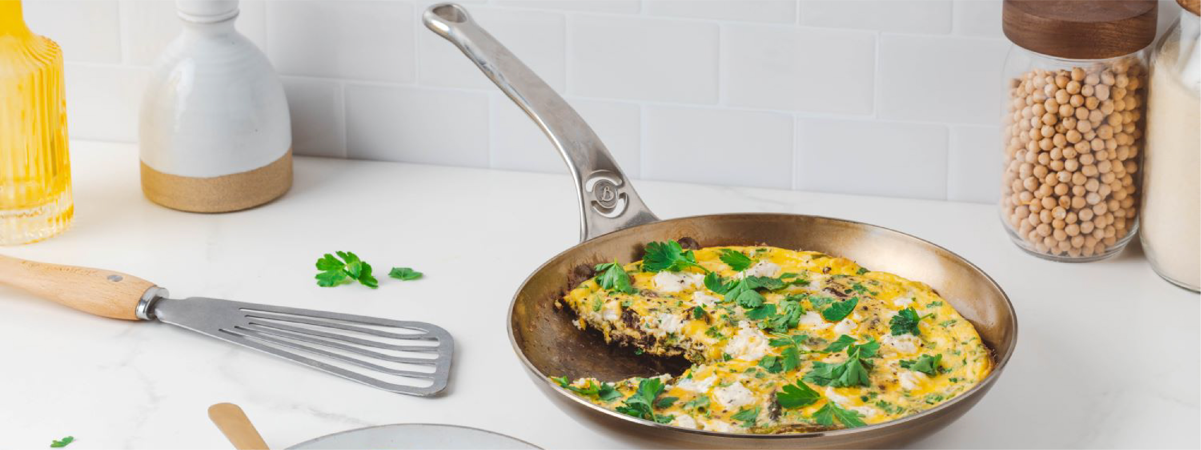 2. 首先將烤箱預熱至 350°F,並將烤架放在上方三分之一處。使用我們家的DE BUYER MINERAL B PRO 煎蛋鍋,導熱效果極佳的鐵鍋會是你的最佳鍋具。
