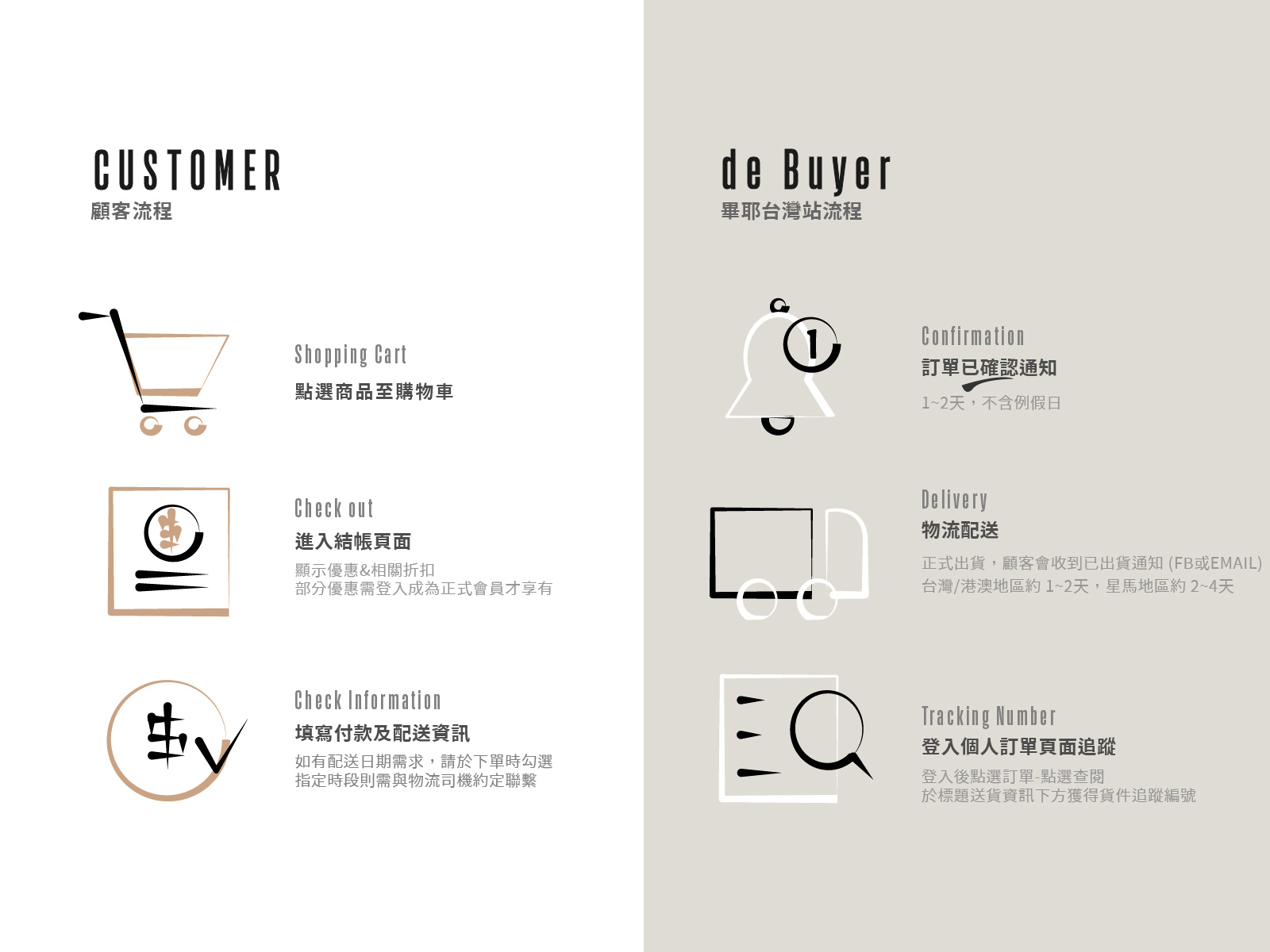 特殊活動/絕版/福利/展示商品特售期間,請注意下單不代表訂單成立;未能正式成立之訂單將於7日內收到100元購物金的折抵,作為de BUYER禮贈補償。