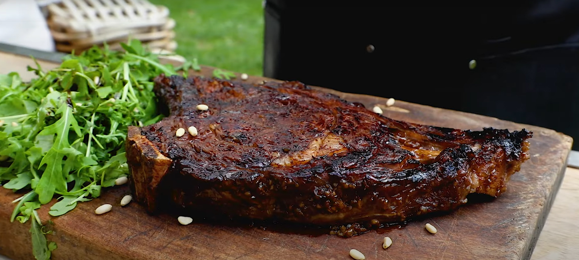 邊烤邊將剩餘的醬汁刷在牛排上。