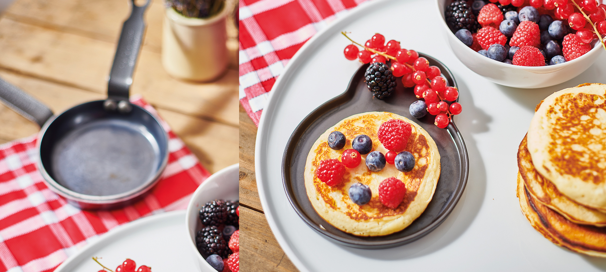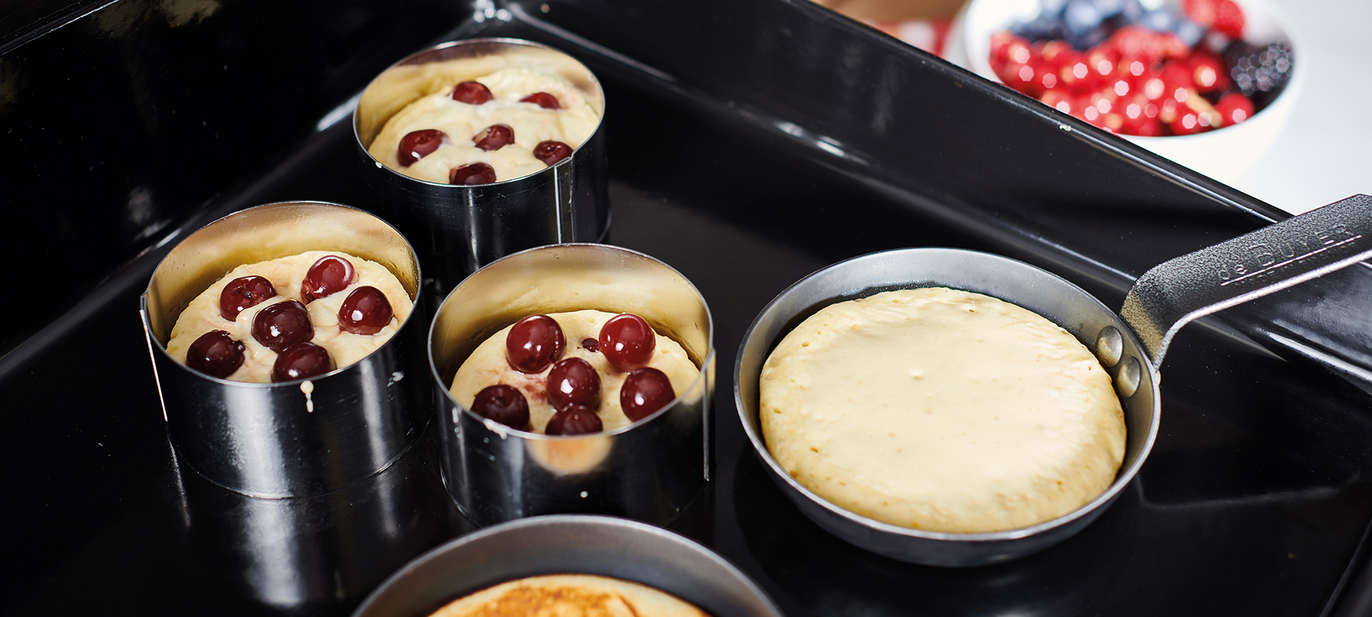 • Grease your blini pan liberally and fill 1/3 full on the grill. • Add 5 - 7 Griottines® (or other fruits).