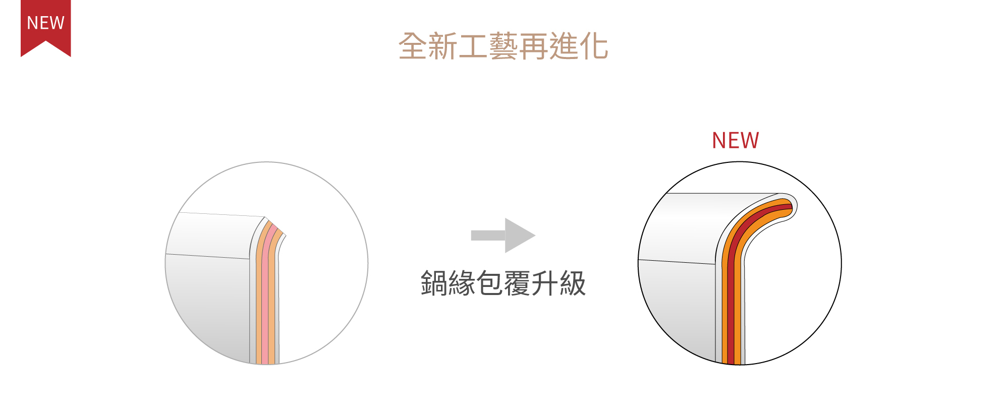 封邊強化:5層複合金屬結構鍋邊鍋緣全面封閉,提升耐用度。