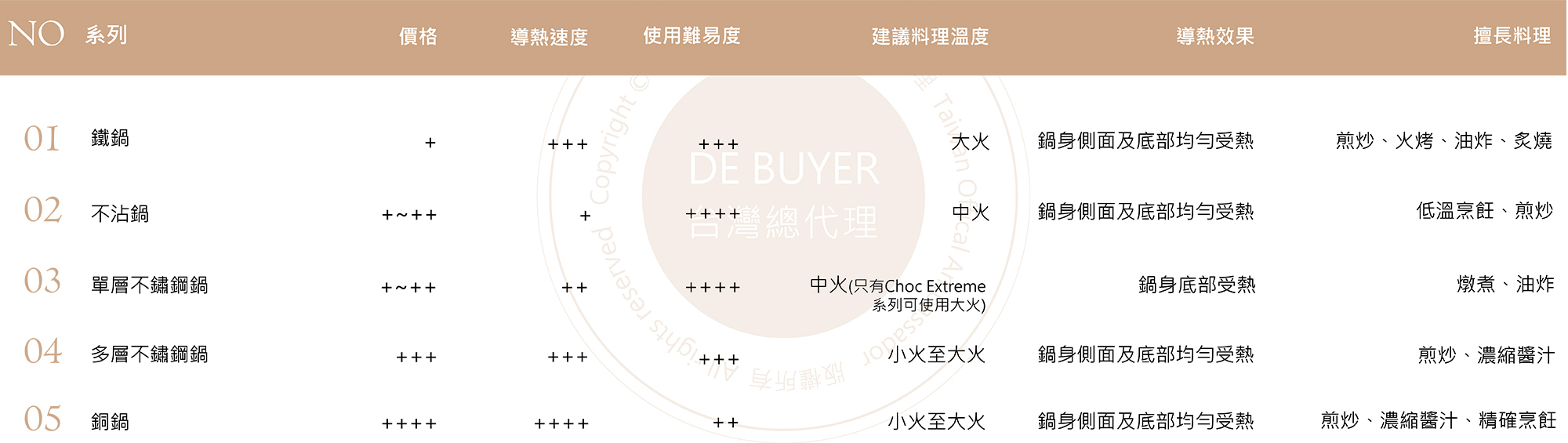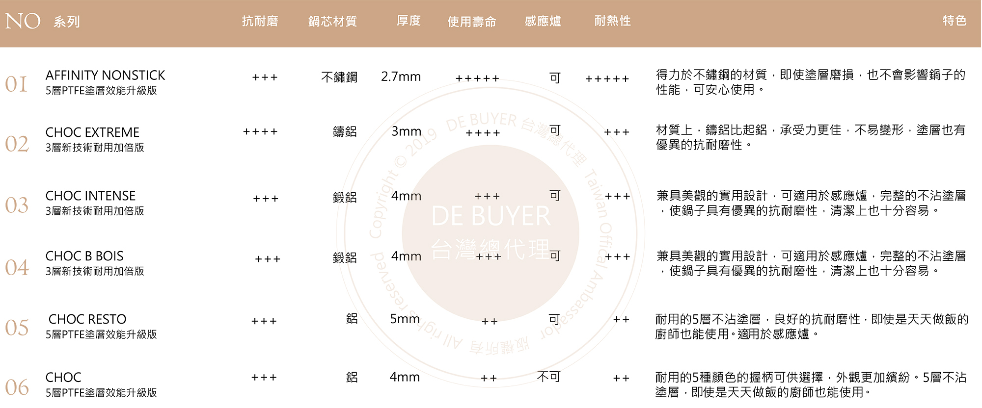 專業不沾塗層符合廚師級專業、耐用需求,易清潔用於居家烹飪更是絕佳品質。市場上唯一加厚 4~5mm (依直徑大小而定) 鋁製內身,能夠有效加速導熱增加商品壽命。直火鍋身耐熱達200度,高溫下不沾效果依然優秀。