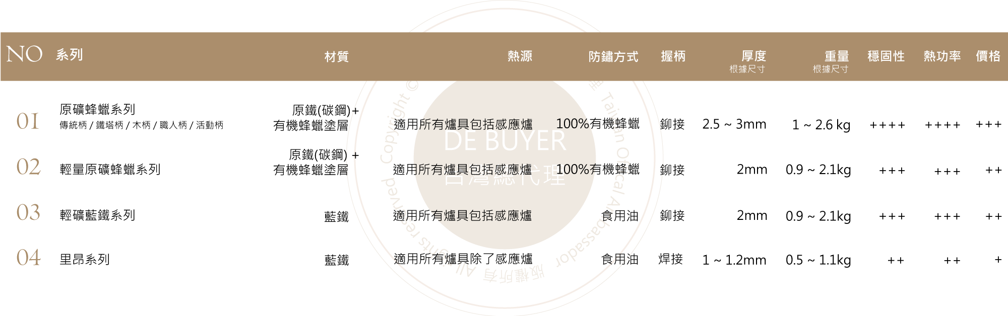 原礦蜂蠟系列:採用99.9%原鐵礦,並以100%天然蜂蠟作為新鐵鍋外層防鏽的素材,隔絕鍋具表層以減少生鏽。