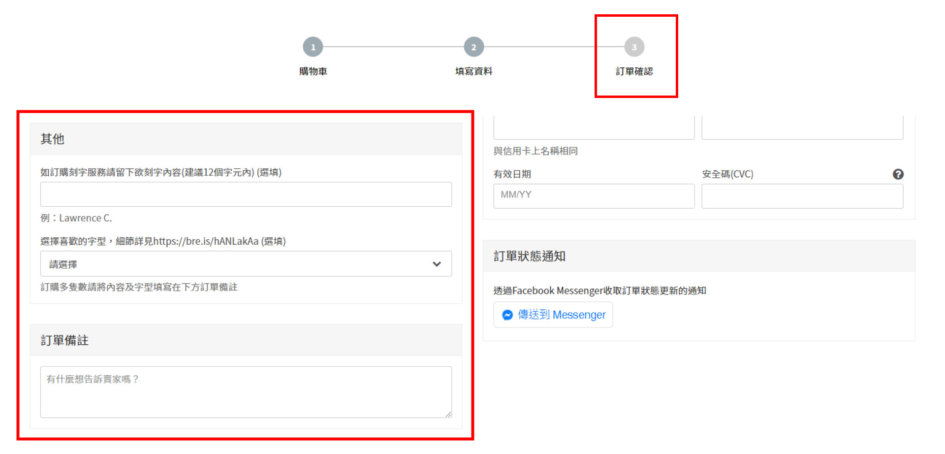 超簡單的下單流程 : 適用製化刻字服務商品於選購時需選擇” 優惠加價加購”選項,結帳時於訂單確認內的「其他」留下刻字內容 & 選擇字體樣式。