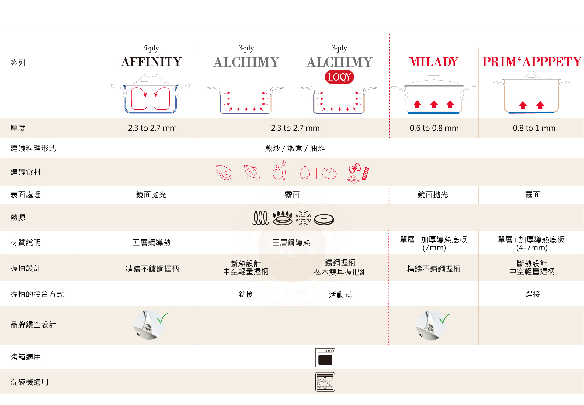 Alchimy、Prim'appety系列配搭不鏽鋼空心管把手,中空設計用於排出熱量並減少導熱溫度,把手比較不易變燙。