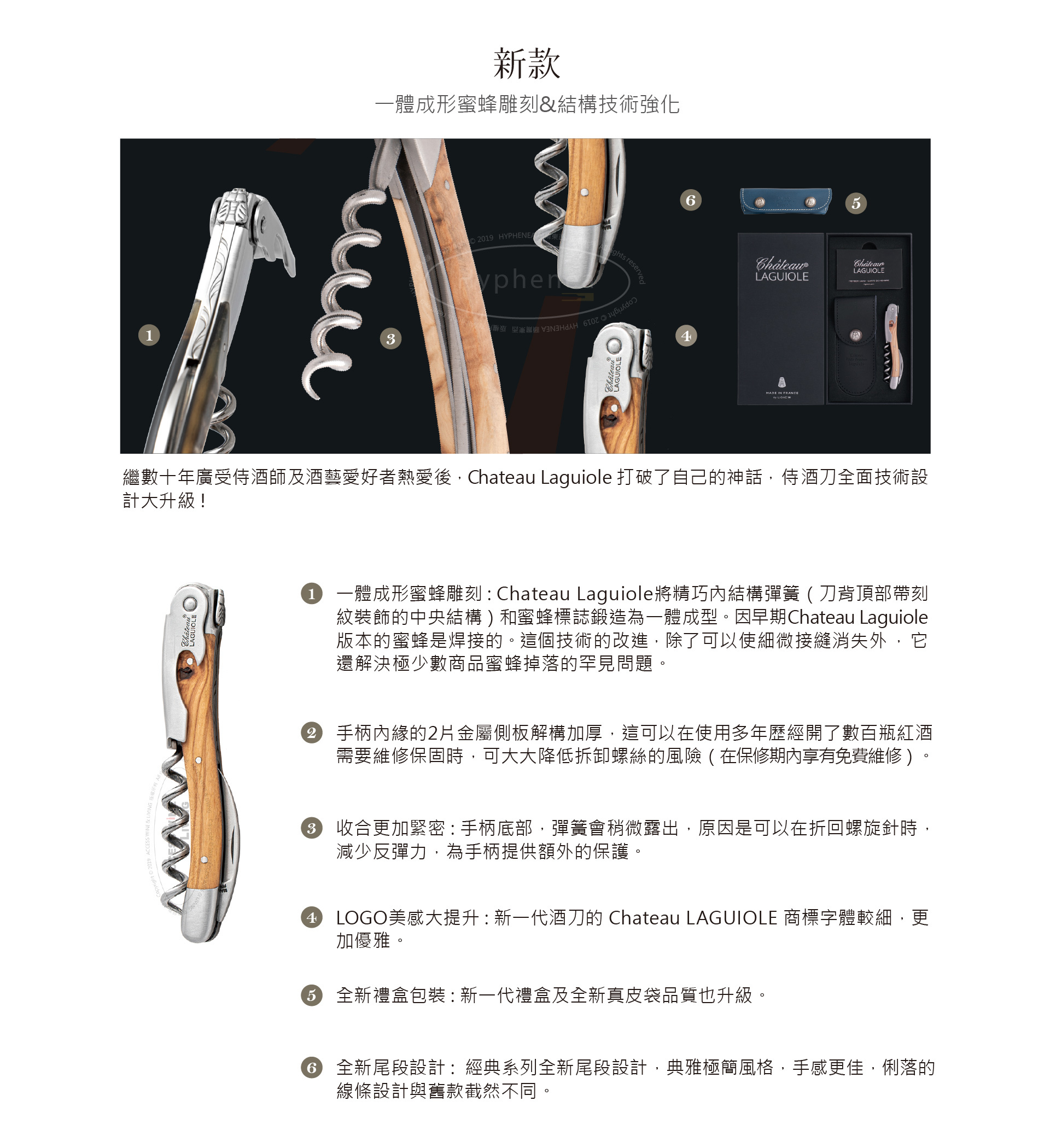 Chateau Laguiole (pronounce LAYOL) 侍酒刀高雅細緻的曲線、帶有溫潤質感及芬芳氣息的木材握柄、或是擁有獨特質感的牛角握柄、及握在手裡的沉穩質感等特點,都使其廣受世界知名侍酒師及酒藝愛好者的瘋狂熱愛。享有終身保固的Chateau Laguiole奢華酒刀值得您的永久珍藏。.