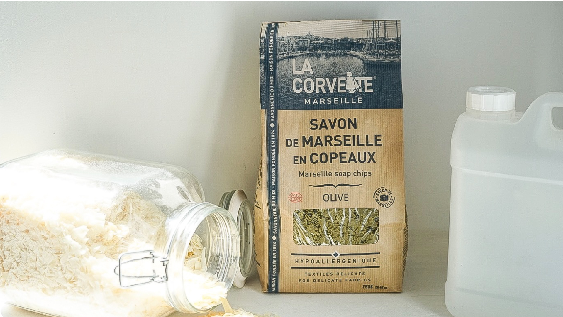 正宗馬賽皂絲100%橄欖油製成,具低過敏性無添加香精色素。選用皂絲可讓您大幅降低減用市售液體洗衣精用量,十分環保經濟於近年法國掀起新洗衣風潮 !