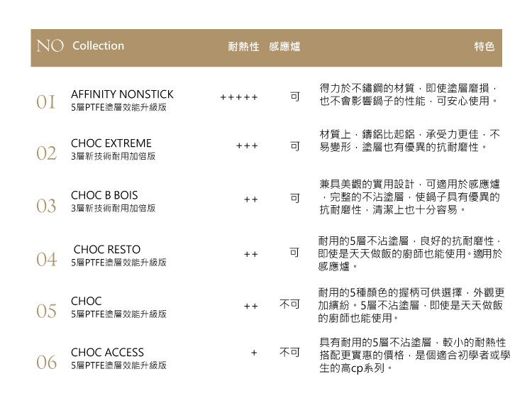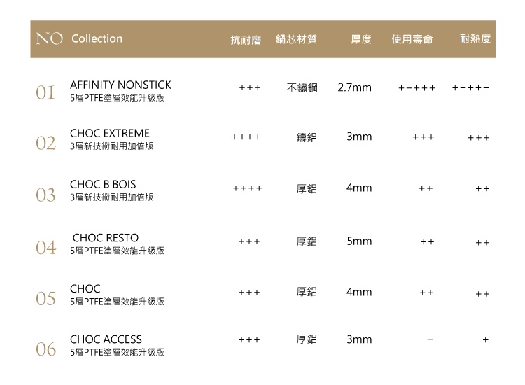 專業不沾塗層符合廚師級專業、耐用需求,易清潔用於居家烹飪更是絕佳品質。市場上唯一加厚 4~5mm (依直徑大小而定) 鋁製內身,能夠有效加速導熱增加商品壽命。耐熱達250度,高溫下不沾效果依然優秀。