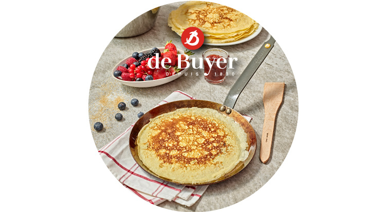 圓形平底煎鍋型,低鍋身鍋裙設計,專為可麗餅設計(可另選購DE BUYER可麗餅專用櫸木煎鏟&T字棒)。讓煎一塊完整漂亮且薄脆的法式可麗餅不再困難。