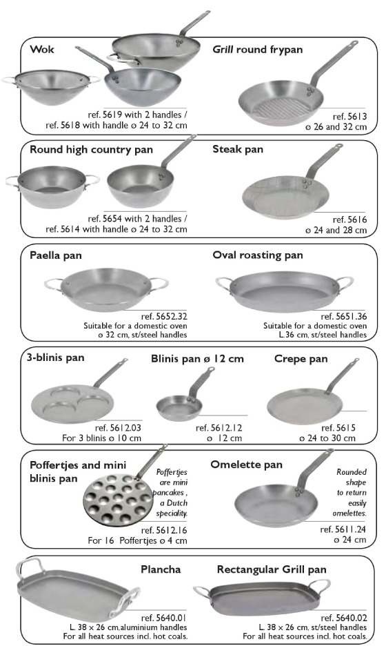 耐用的鐵鍋非常適合高溫烹飪,是市售唯一不因高溫而簡短使用壽命的鍋具材質,可以快速導熱並保持高溫,使料理有絕佳的焦糖化效果,鎖住食材原味,不論炙燒、火烤牛排、洋蔥、蔬菜、馬鈴薯,或是的高溫油炸料理,絕對是主廚唯一的首選。鐵鍋較不適用於燉煮或是需長時間高水份烹飪的料理。