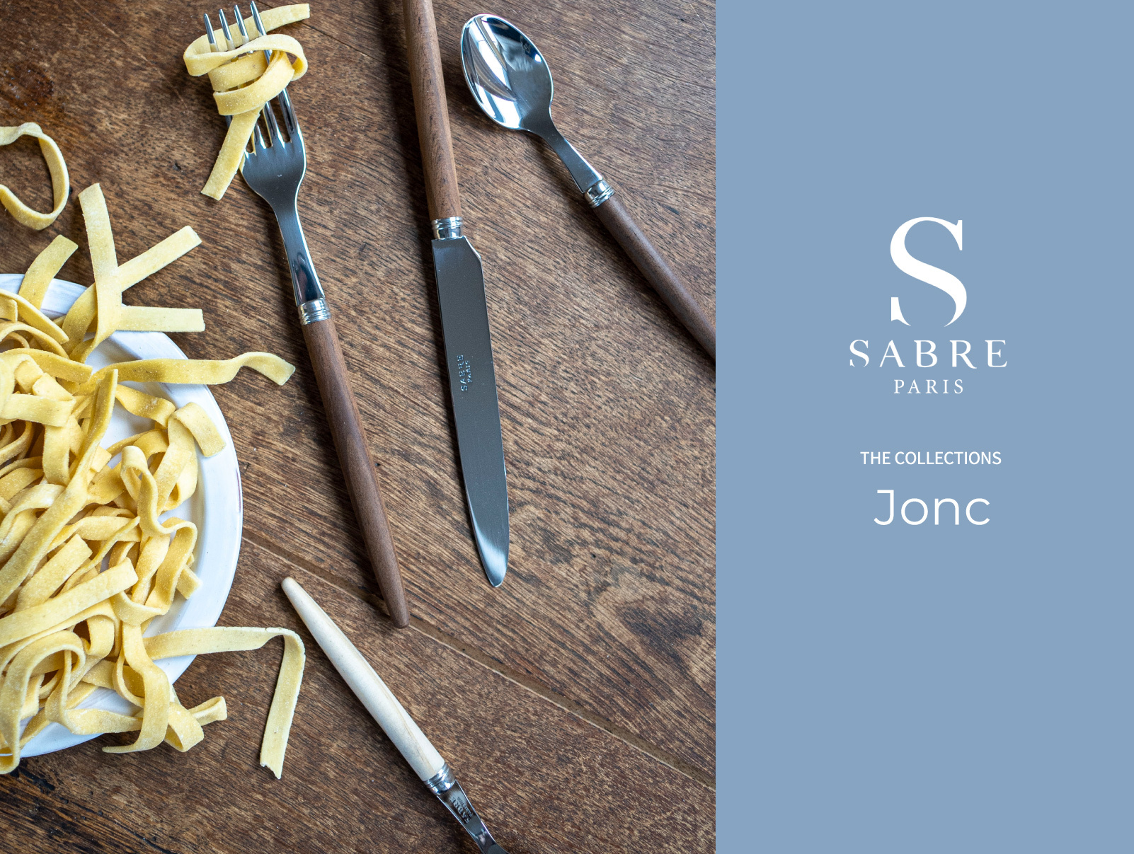 一個充滿巧思發想於經典法國圓帽畫家的筆桿。首先筆直而纖細的手柄,靈感來自筆刷,選用高端環保木料材質給予最真實的木質質感,卻又能以45度中低溫洗碗機清洗提昇日常清潔便利性。本系列由淺色或深色木材製成。而SABRE以招牌絕佳手工,將木端與不銹鋼各主功能刀/匙結合,優雅呈現於餐桌。您可以利用筆筒.餐具桶收納,別有風味!