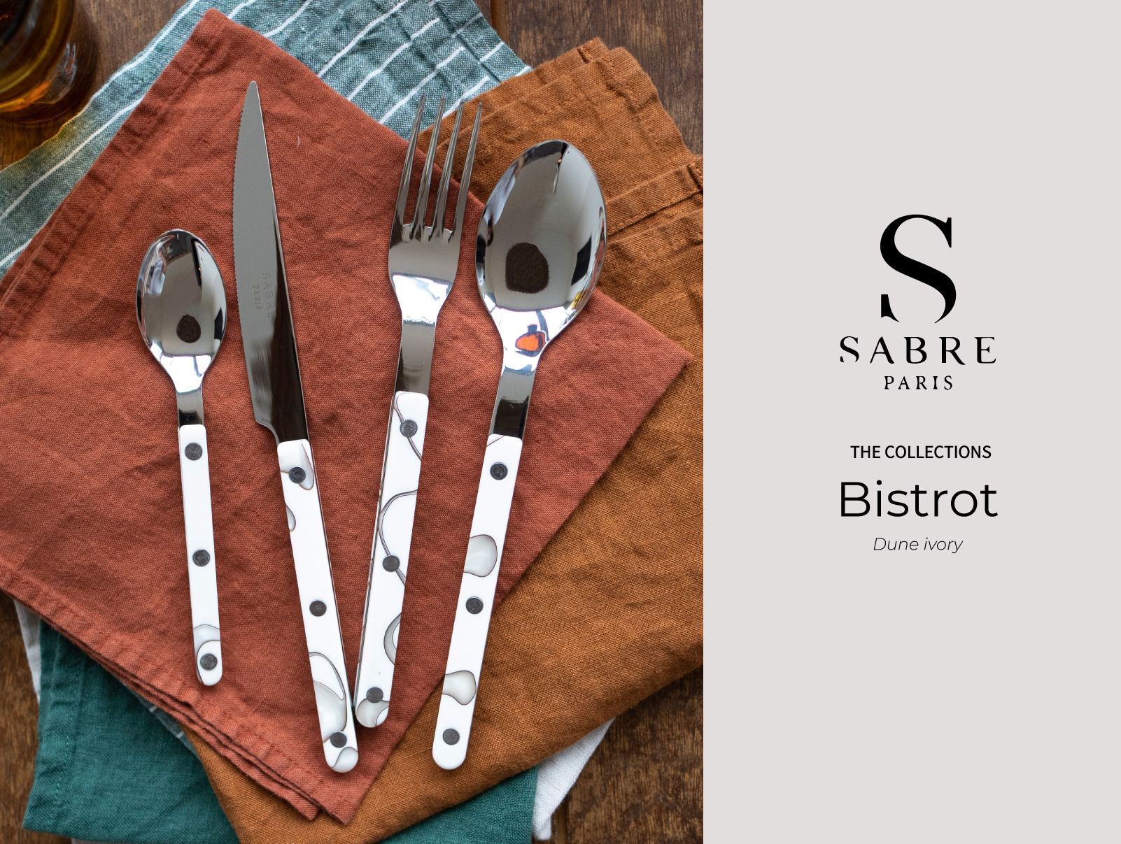 握柄與餐具前端的不銹鋼主體,以純手工銜接格外耐用,並手工細緻拋光以確保每一件餐具品質與外觀兼顧。Bistrot另有多款混合風材質,讓您的桌子體現您的個性!水牛、牛角、玳瑁、柚木、黑色沙丘、象牙沙丘:想要花俏和混合嗎? 可以回到系列介紹找到我們!(陸續上市中)