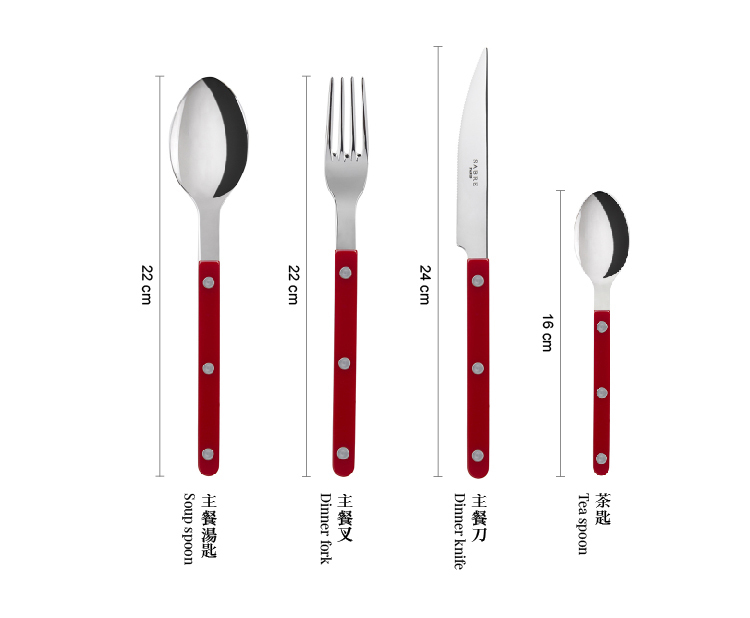 握柄與餐具前端的不銹鋼主體,以純手工銜接格外耐用,並手工細緻拋光以確保每一件餐具品質與外觀兼顧。Bistrot另有多款混合風材質,讓您的桌子體現您的個性!水牛、牛角、玳瑁、柚木、黑色沙丘、象牙沙丘:想要花俏和混合嗎? 可以回到系列介紹找到我們!(陸續上市中)