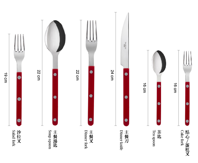握柄與餐具前端的不銹鋼主體,以純手工銜接格外耐用,並手工細緻拋光以確保每一件餐具品質與外觀兼顧。Bistrot另有多款混合風材質,讓您的桌子體現您的個性!水牛、牛角、玳瑁、柚木、黑色沙丘、象牙沙丘:想要花俏和混合嗎? 可以回到系列介紹找到我們!(陸續上市中)